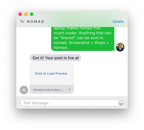 Being able to text from my laptop makes nomad that much cooler. Anything that can be “shared” can be sent to nomad. Screenshot > Share > Nomad.